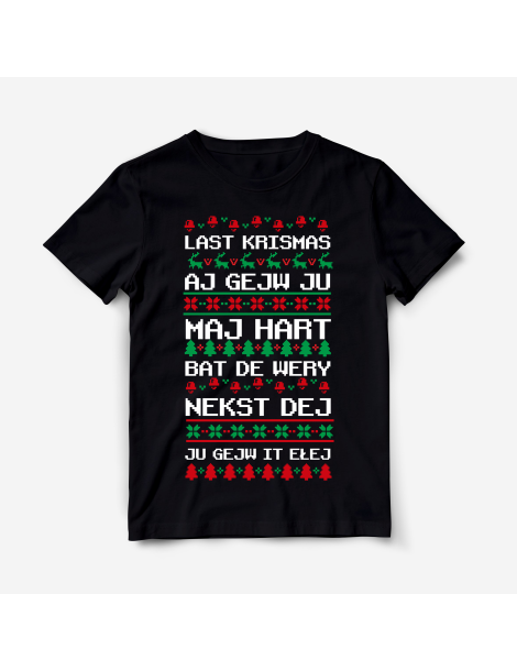 Na przodzie koszulki znajduje się ilustracja w charakterystycznym pikselowym stylu z napisem "Last christmas aj gejw już maj hart"
