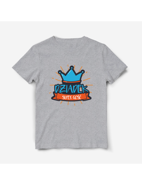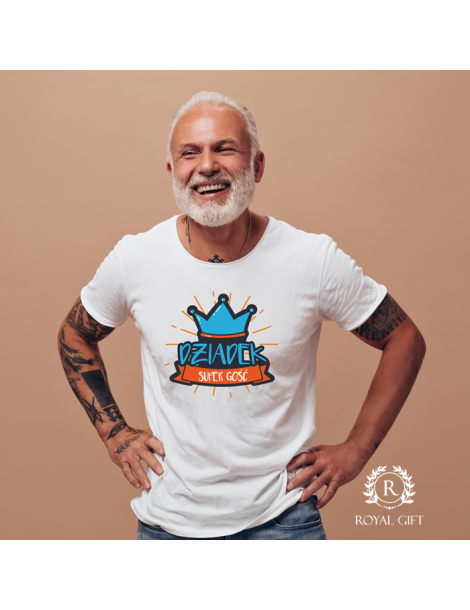 Na przodzie koszulki znajduje się ilustracja korony z napisem "Dziadek super gość"